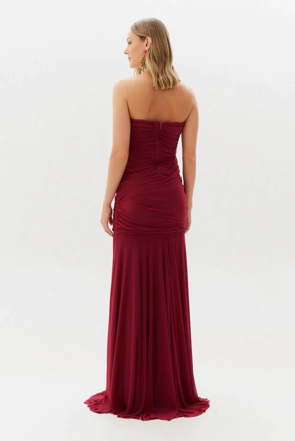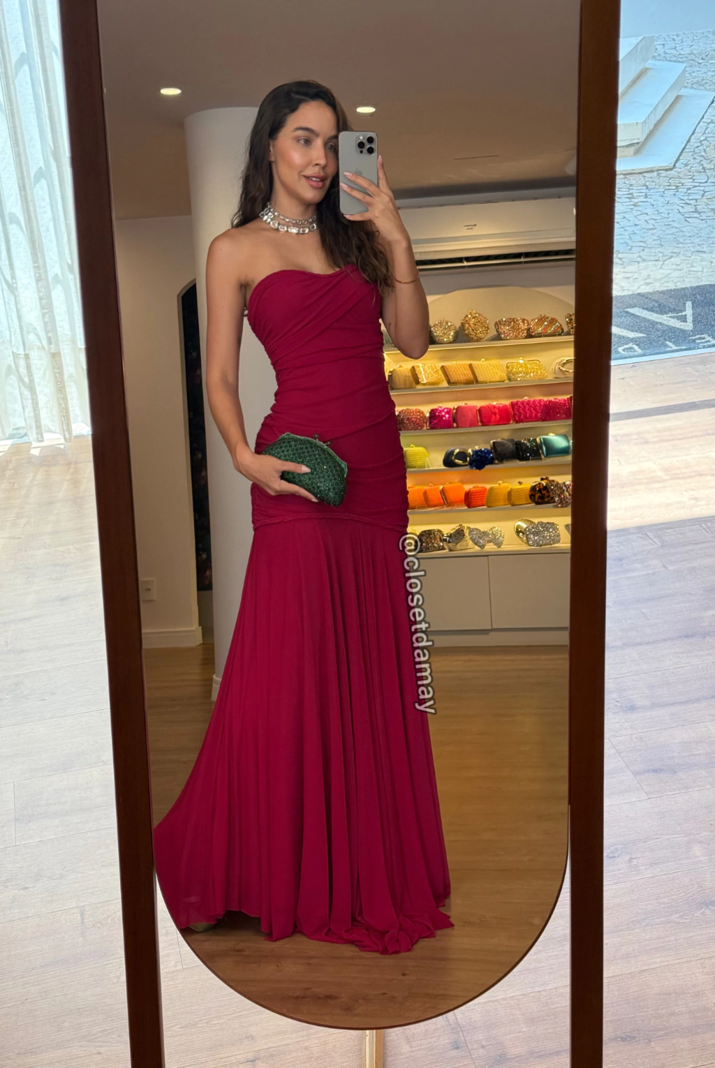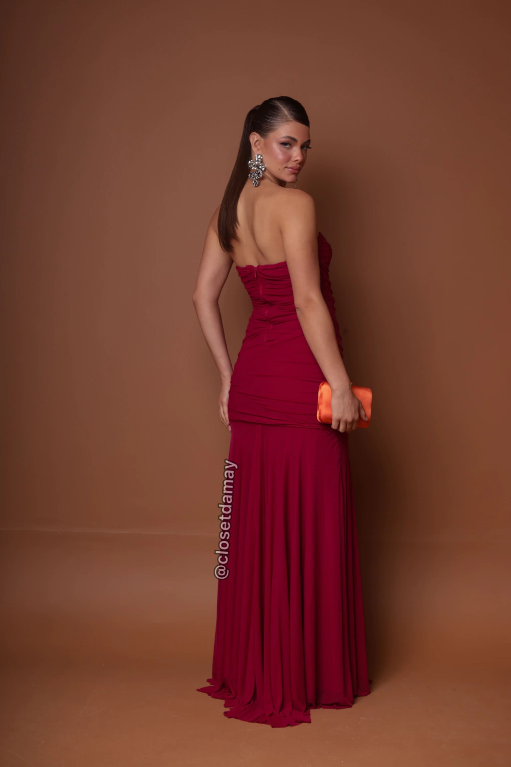 Vestido longo de tule em marsala, com decote coração tomara que caia e detalhes em trança que acrescentam um toque de sofisticação à peça.