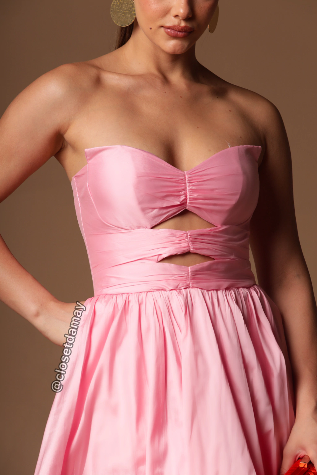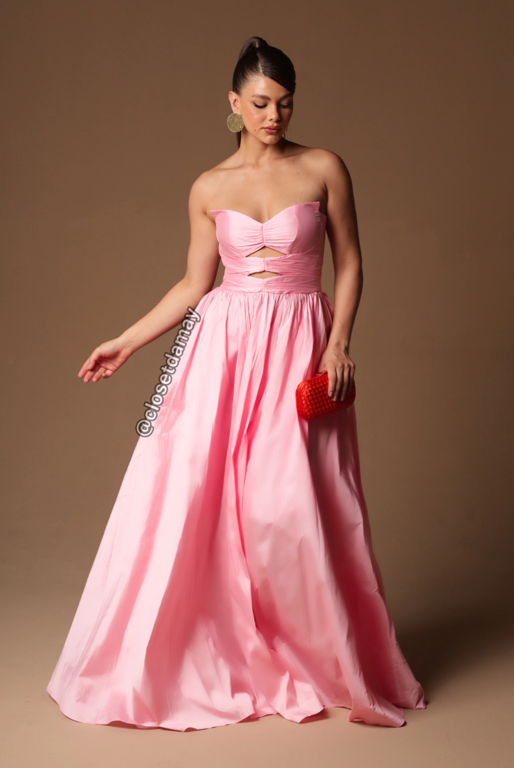 Vestido de festa longo, tomara que caia, decote coração e recorte central - Rosa