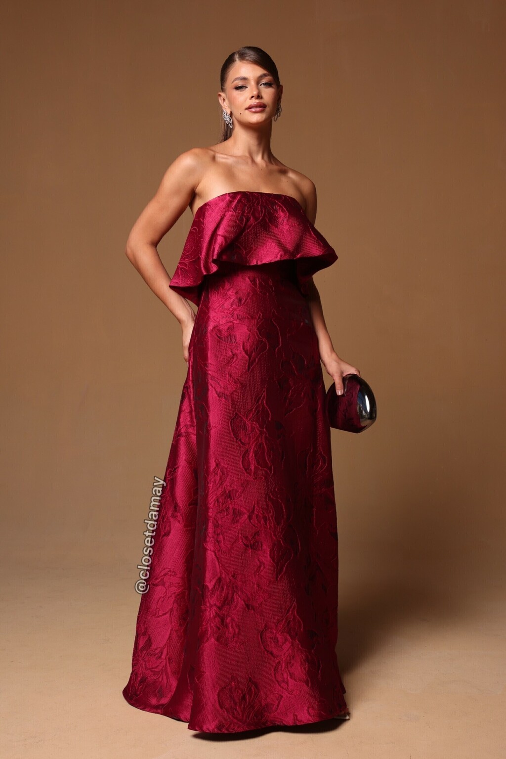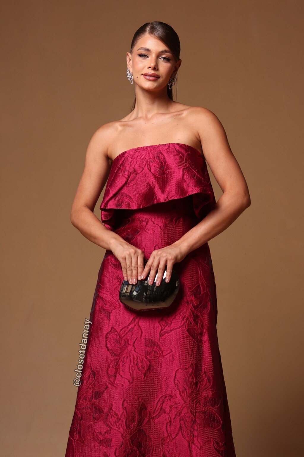 Vestido de festa longo, em jacquard, tomara que caia, com decote reto e bordado no busto com saia evasê. Possui bojo, forro e zíper.