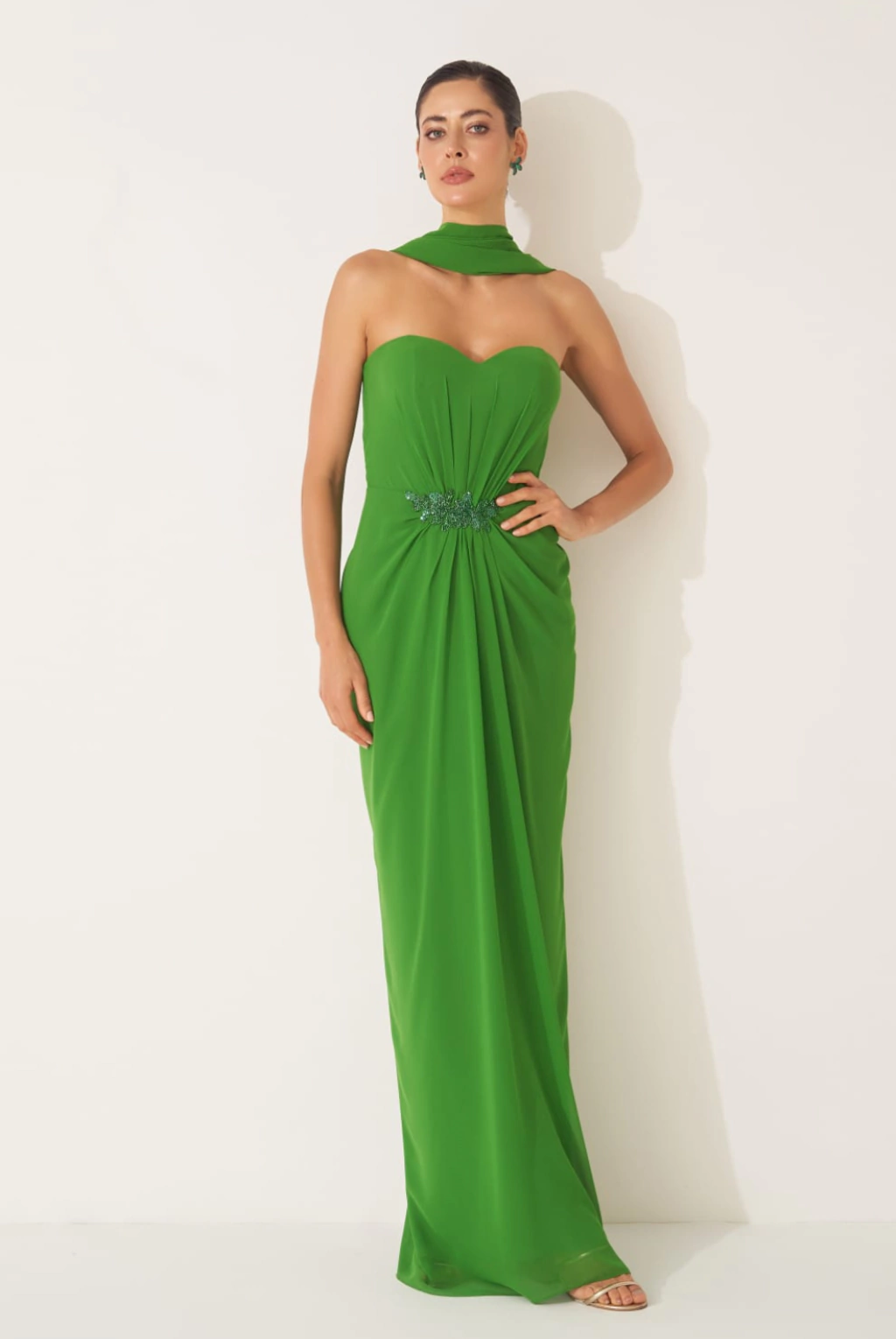 Vestido longo de elegância etérea em chiffon leve, com decote coração sem alças que valoriza o colo. O franzido central na cintura, junto do bordado de vidrilhos, garante brilho sutil e sofisticação. O drapeado no quadril alonga a silhueta, enquanto a saia reta com fenda traseira traz movimento e modernidade. Para arrematar, acompanha echar