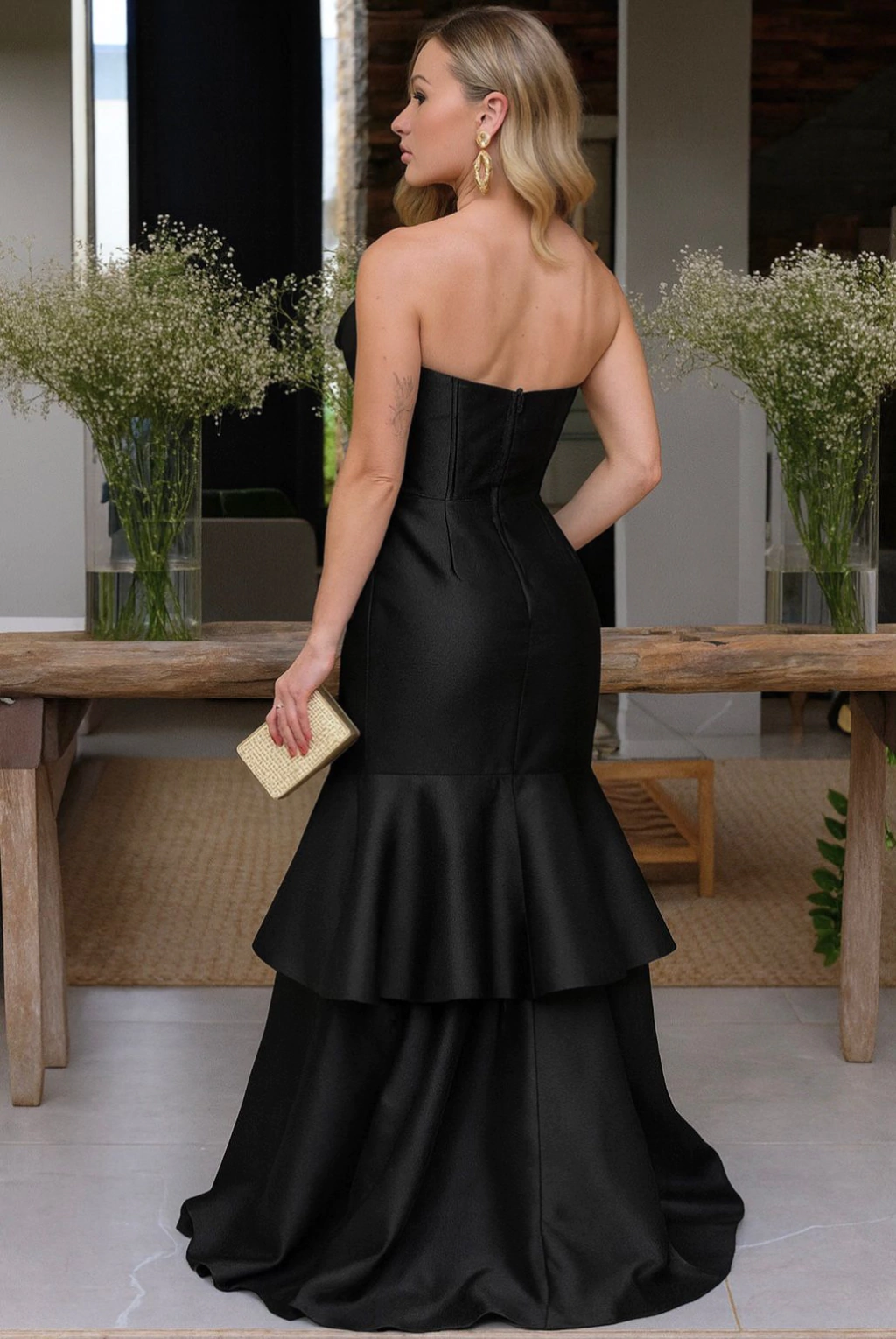 Vestido de festa longo, em zibeline, tomara que caia, decote coração, modelagem sereia. Possui zíper.