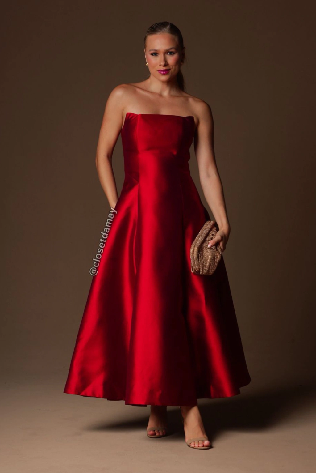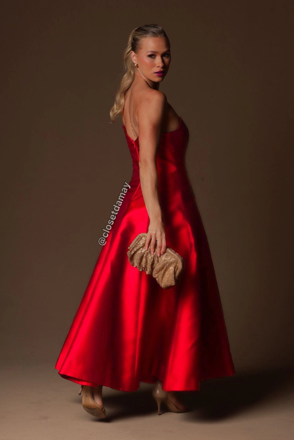 Vestido de festa longuete, em zibeline, busto estruturado, tomara que caia e saia evasê. Possui bojo, forro e zíper.