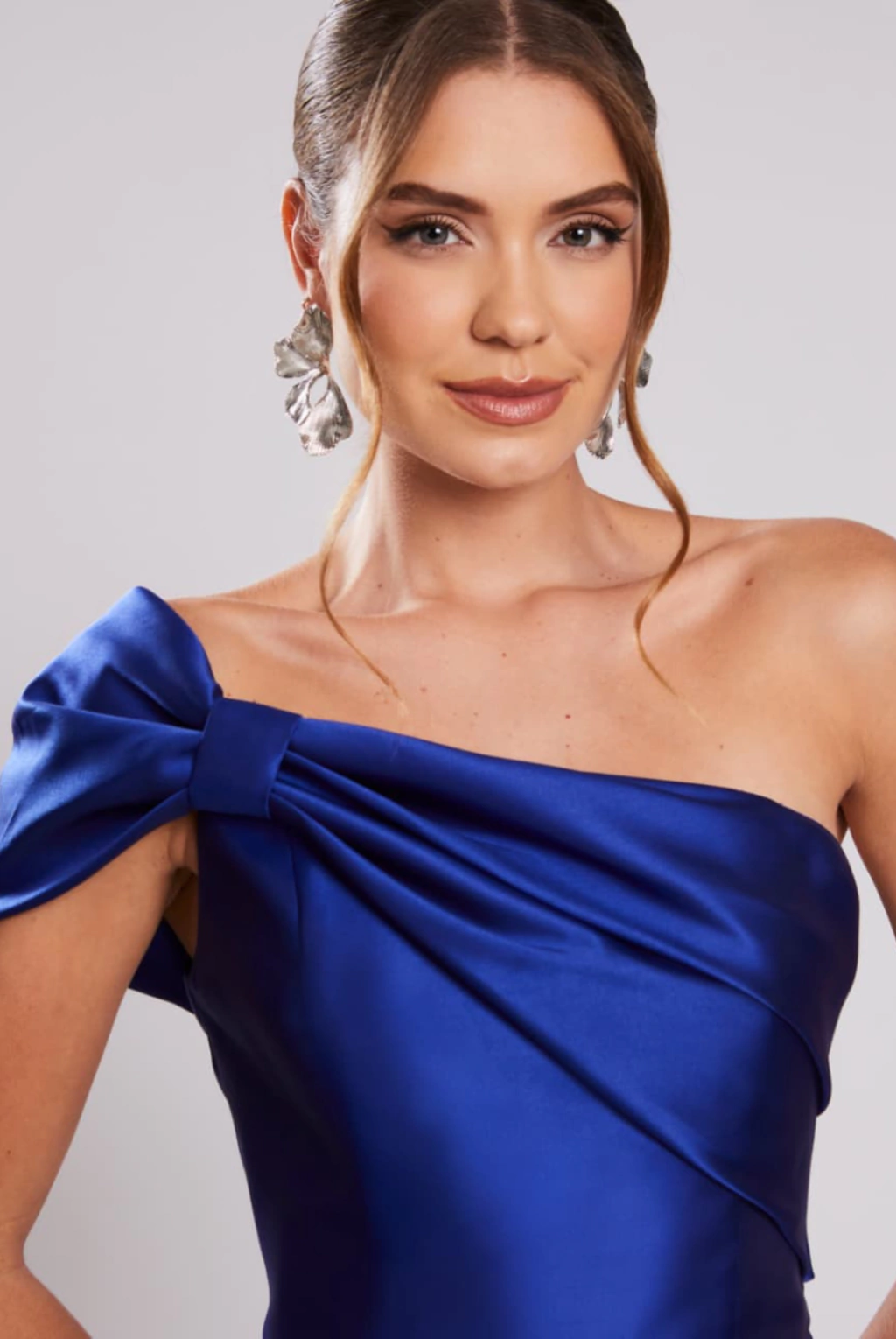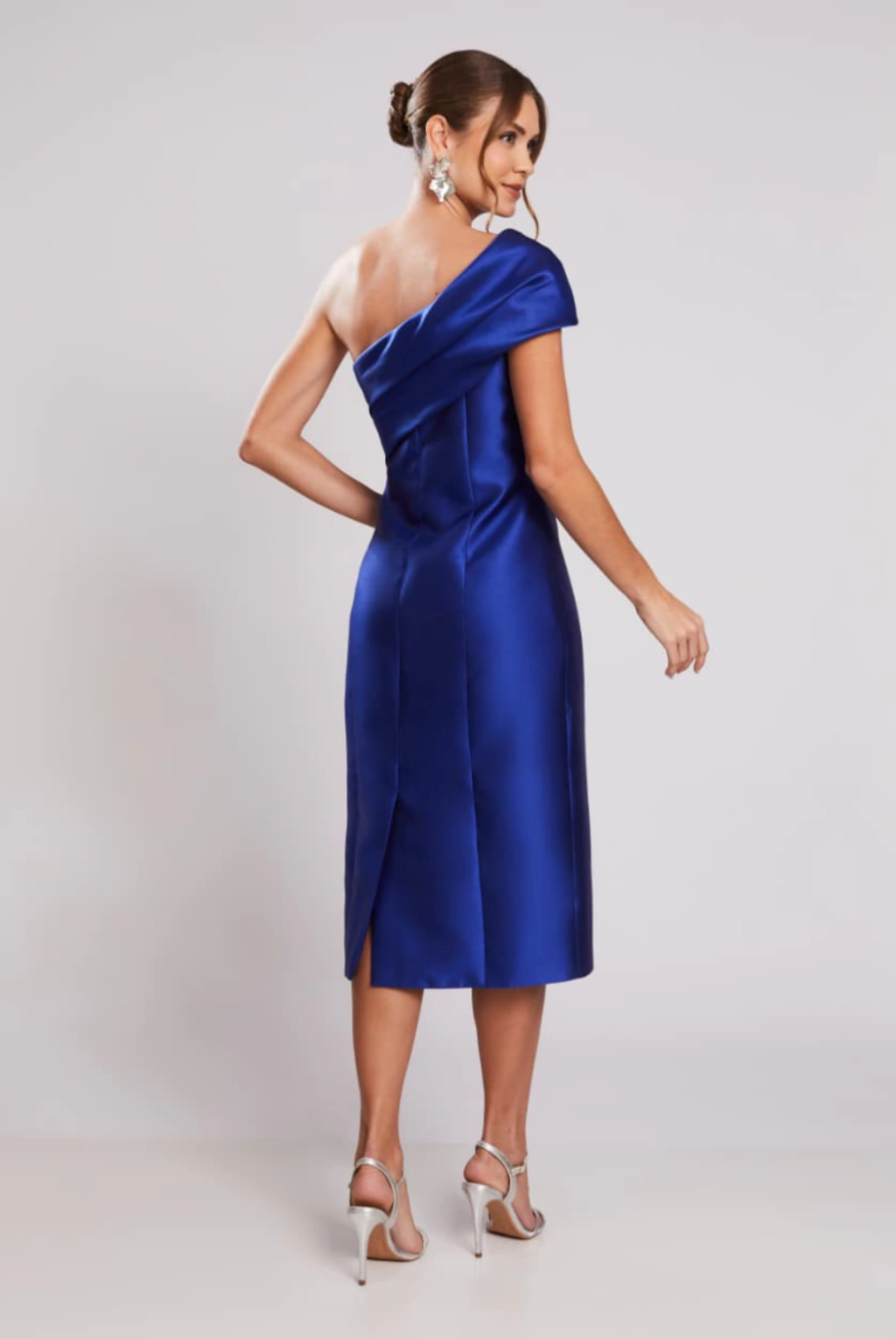 Vestido de festa midi em zibeline, decote assimétrico com detalhe de laço acima da parte lateral do busto, barbatanas de sustentação, modelagem reta e fenda posterior. Possui bojo, forro embutido e zíper lateral.