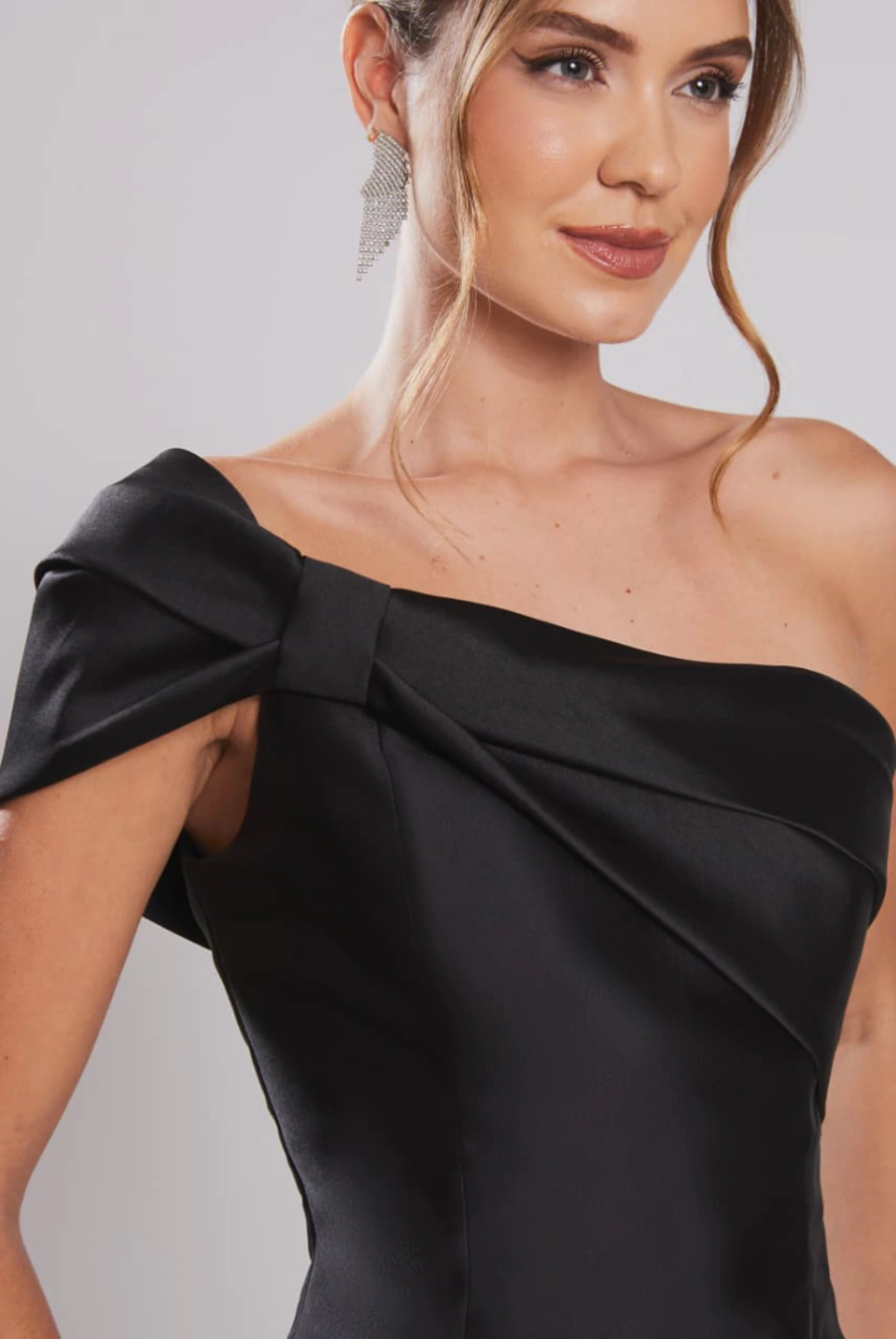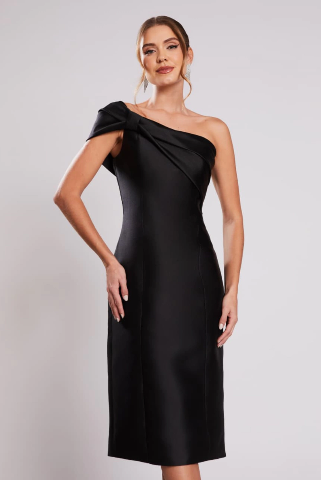 Vestido de festa midi em zibeline, decote assimétrico com detalhe de laço acima da parte lateral do busto, barbatanas de sustentação, modelagem reta e fenda posterior. Possui bojo, forro embutido e zíper lateral.