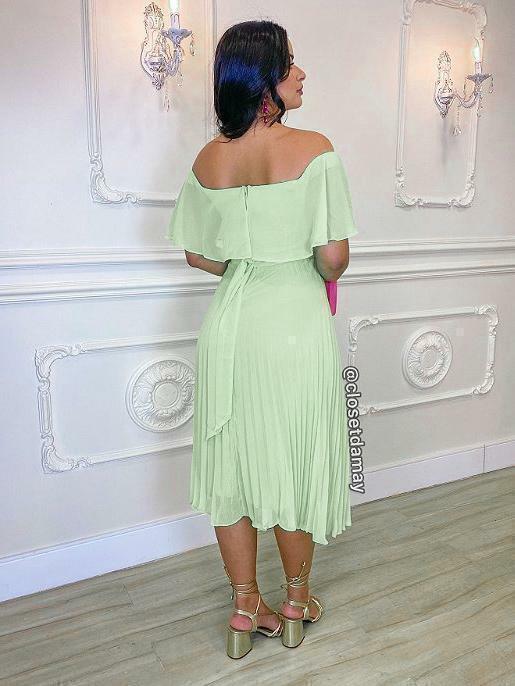 Vestido de festa midi ombro a ombro com babado, faixa removível, com saia plissada, bojo, com elastano na cintura, vestido leve e fluido, ziper invisível nas costas.