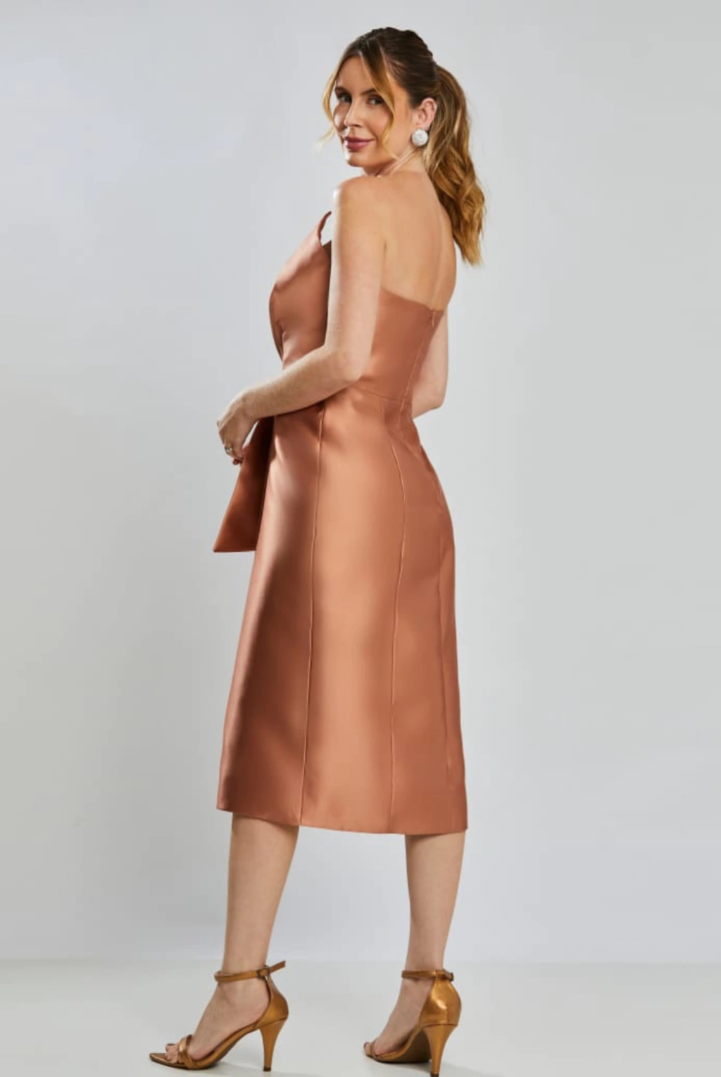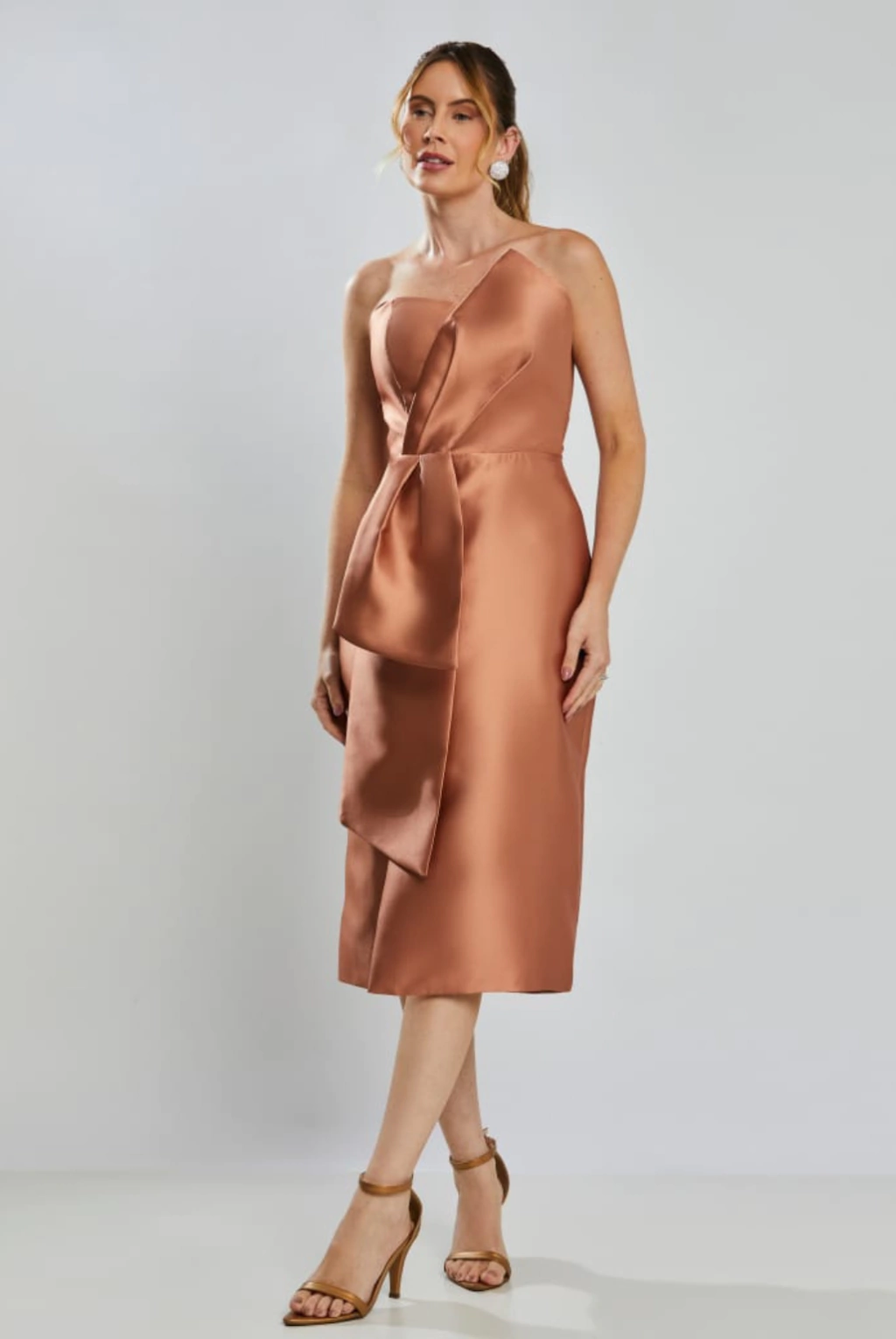 Vestido de festa midi em zibeline, tomara que caia, decote semi-coração com detalhe de pala sobreposta assimétrica drapeada no busto, cascata lateral e fenda. Possui bojo, forro e zíper.