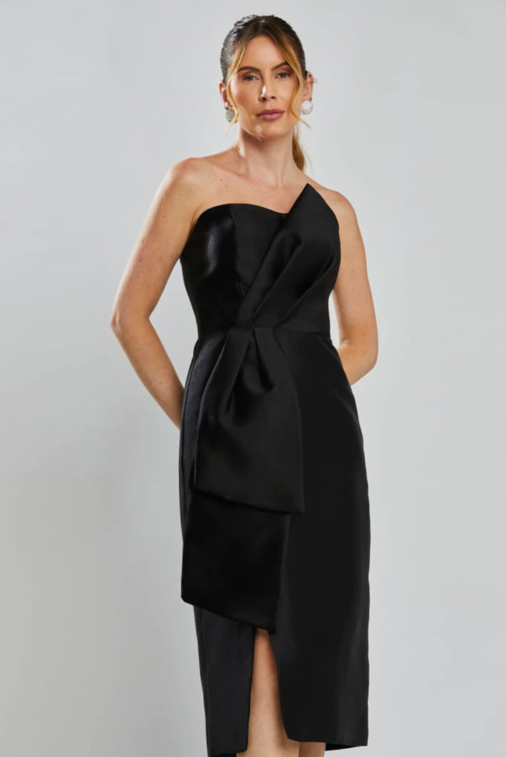 Vestido de festa midi em zibeline, tomara que caia, decote semi-coração com detalhe de pala sobreposta assimétrica drapeada no busto, cascata lateral e fenda. Possui bojo, forro e zíper.