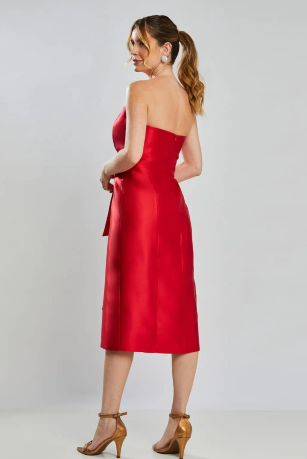 Vestido de festa midi em zibeline, tomara que caia, decote semi-coração com detalhe de pala sobreposta assimétrica drapeada no busto, cascata lateral e fenda. Possui bojo, forro e zíper.