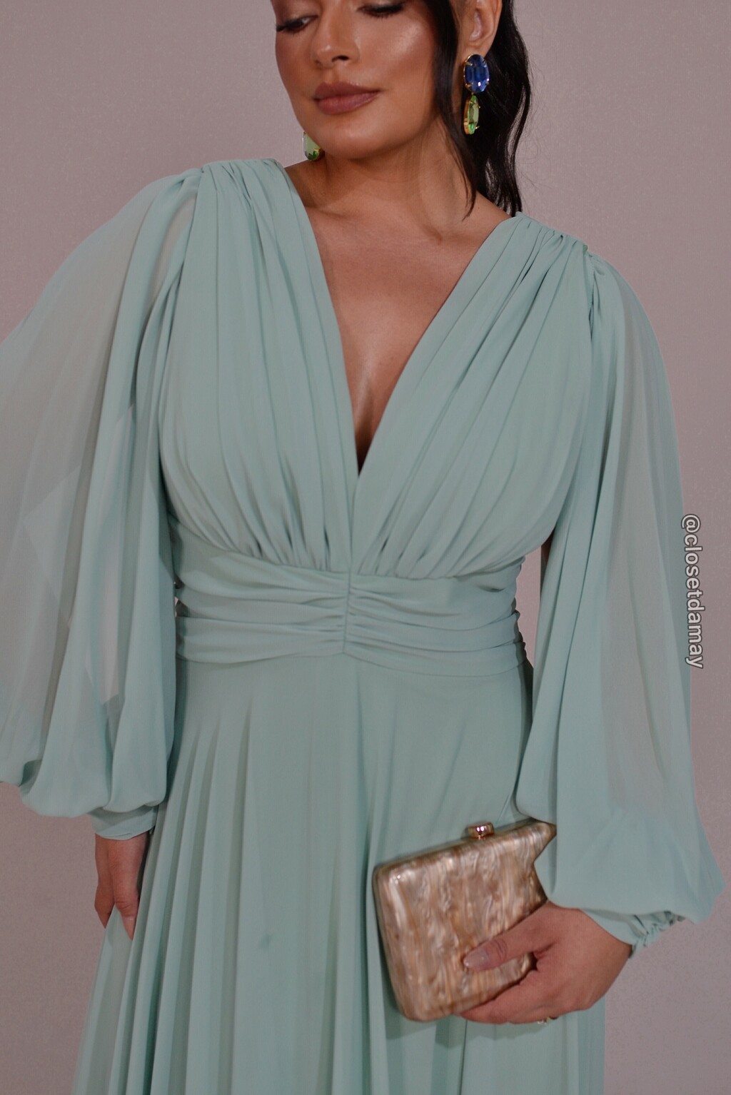 Vestido de festa longo plus size, com busto drapeado, decote em v, mangas longas removíveis e saia evasê. Possui bojo, forro e zíper