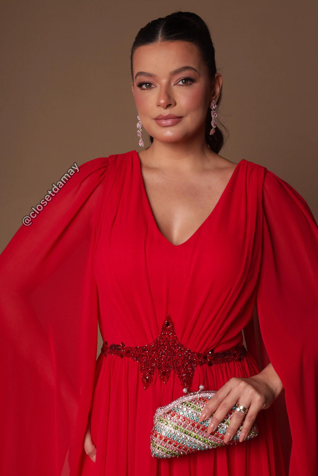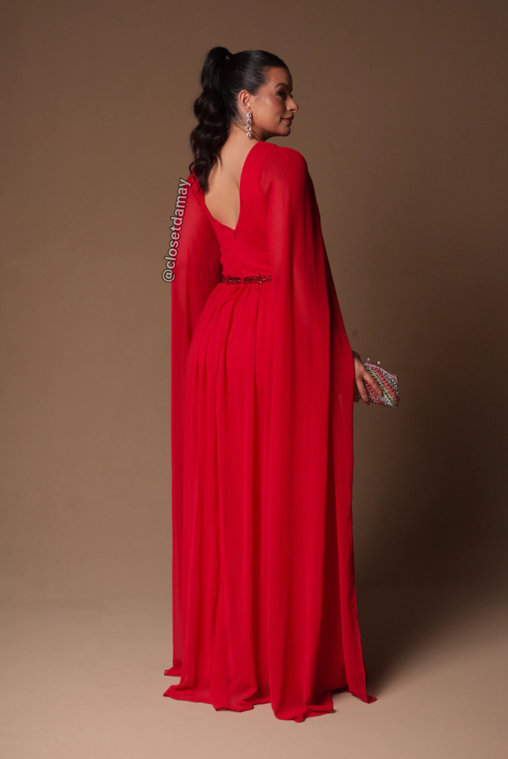 Vestido de festa plus size longo, com capa e bordado em pedraria - Vermelho