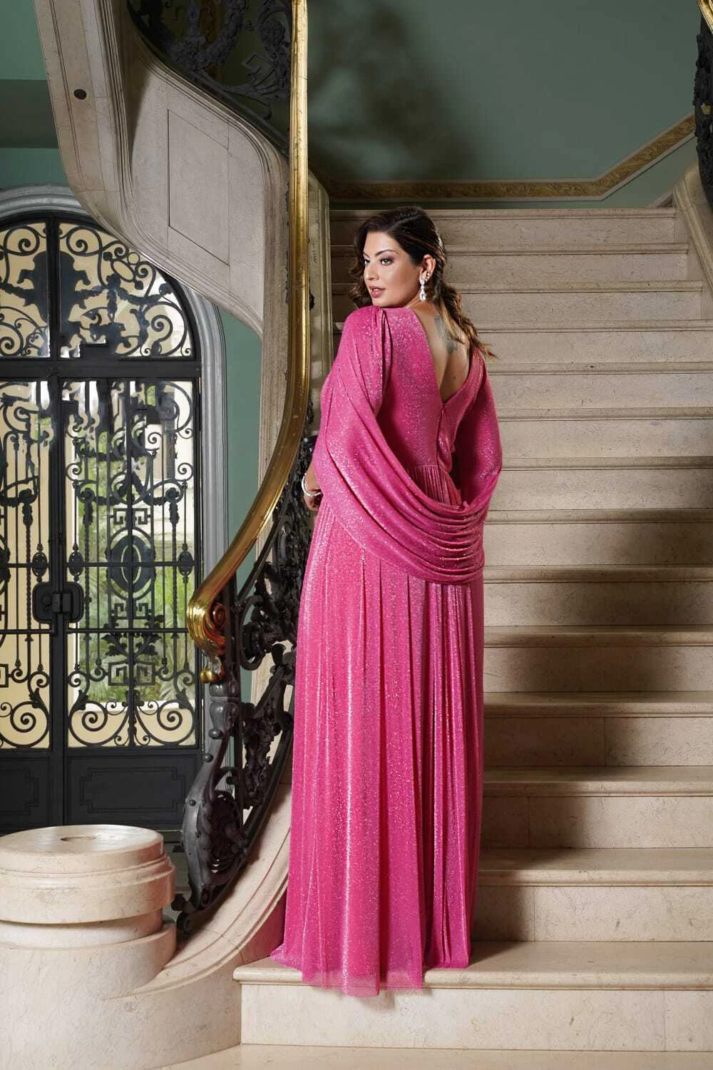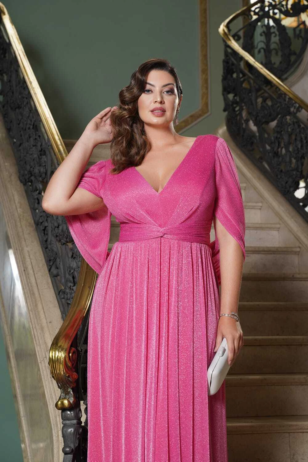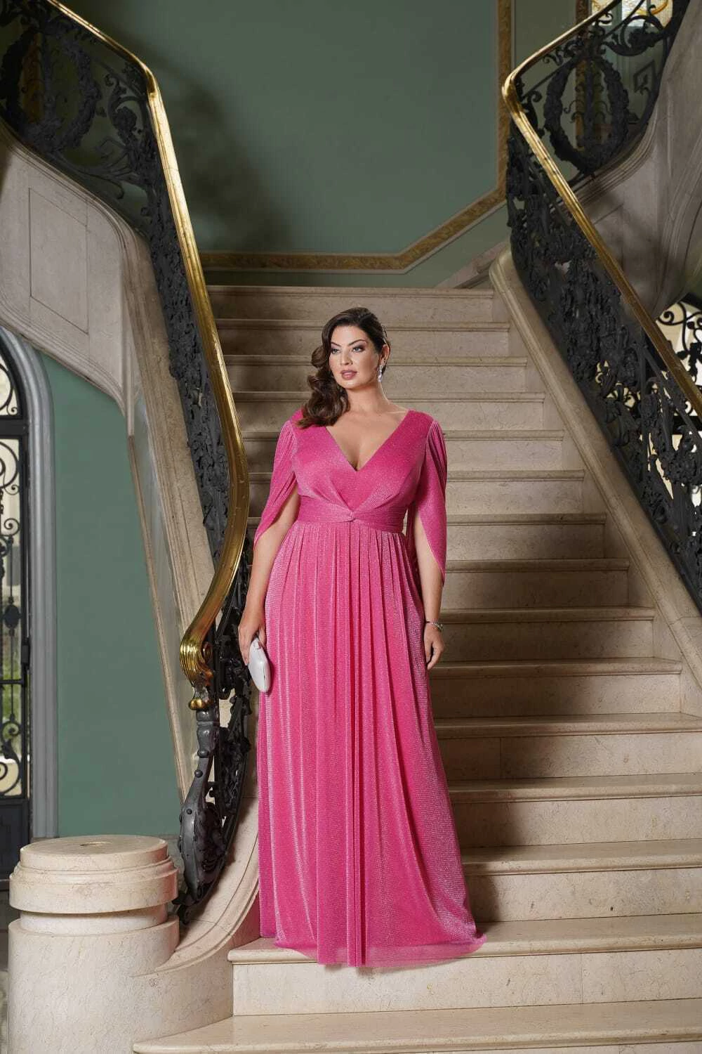 Vestido de festa longo, em lurex, com decote em v, mangas soltas, drapeado na cintura e saia evasê. Possui bojo, forro e zíper.