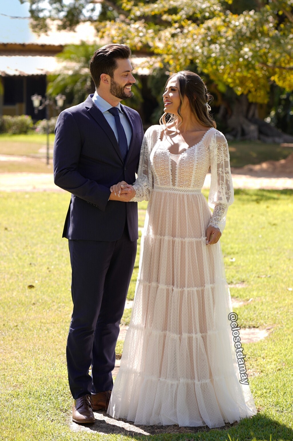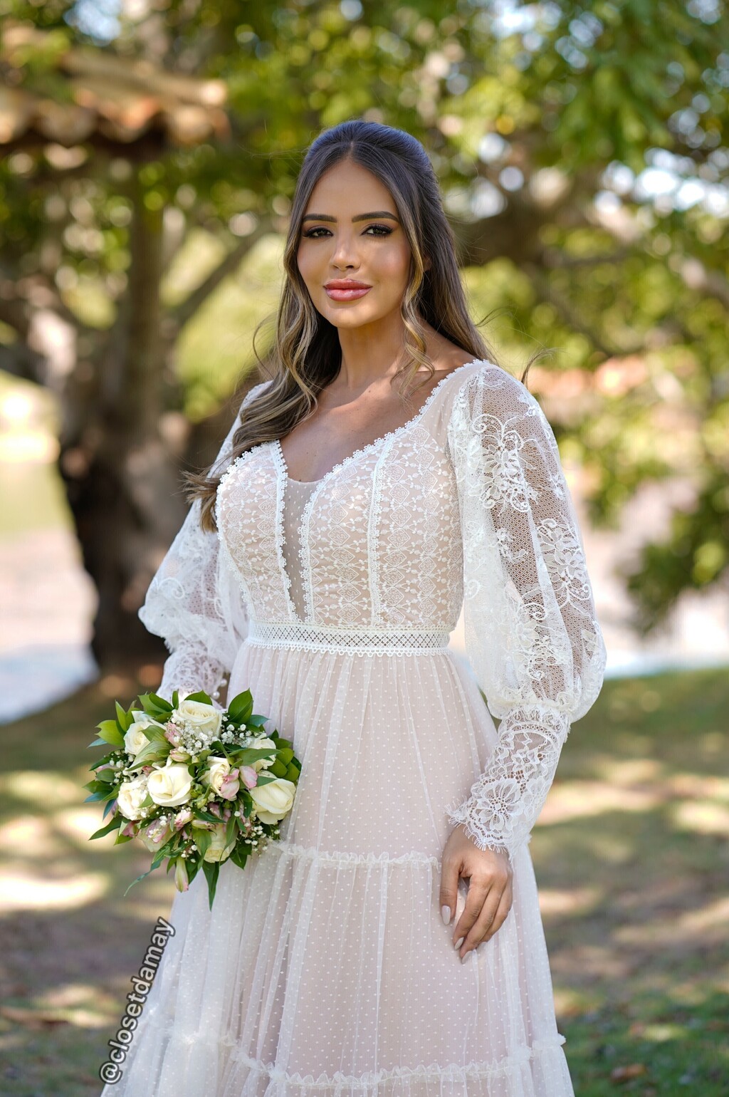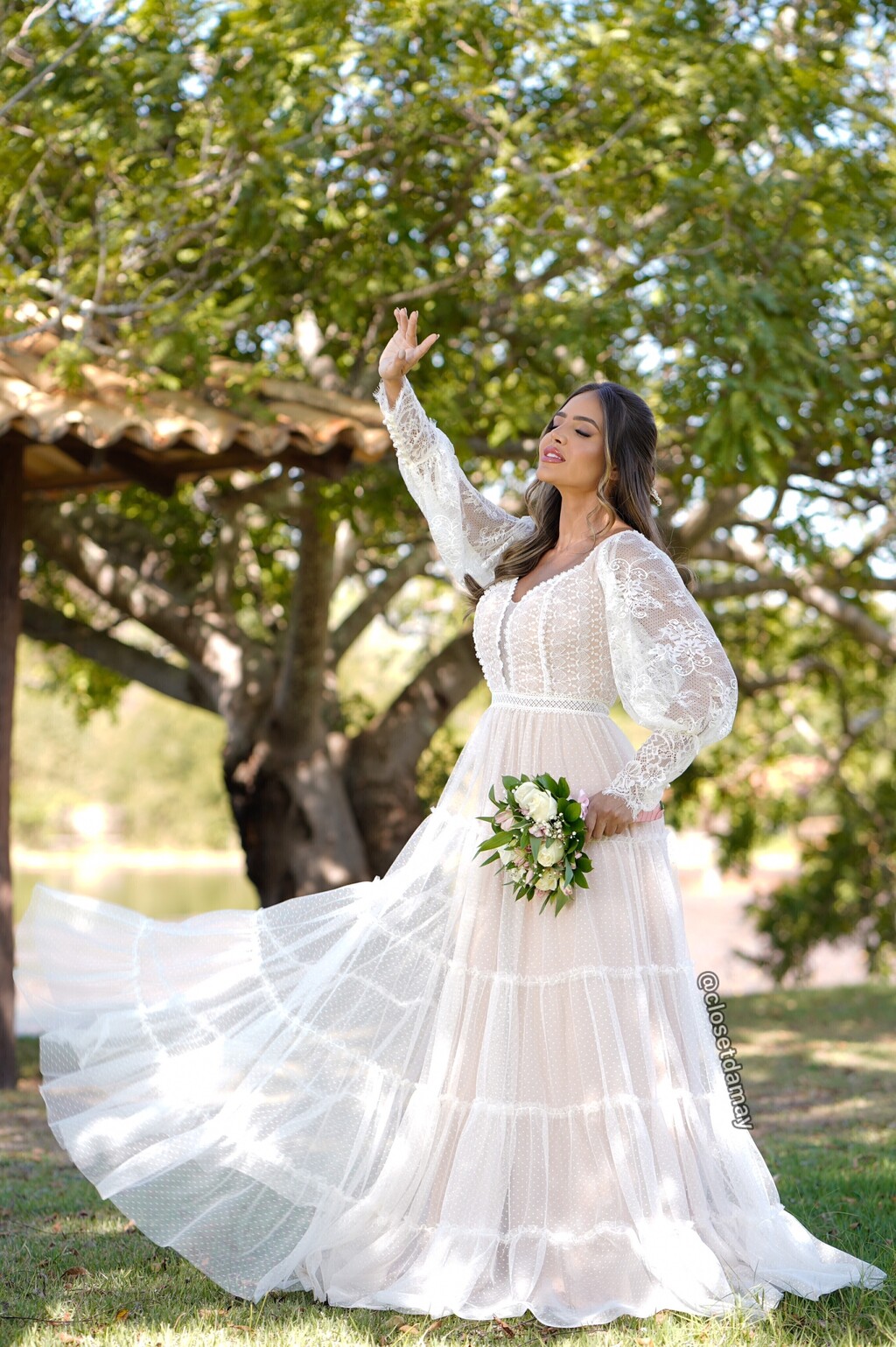 Vestido de noiva longo, com busto de tule e renda, manga longa e saia evasê fluída.