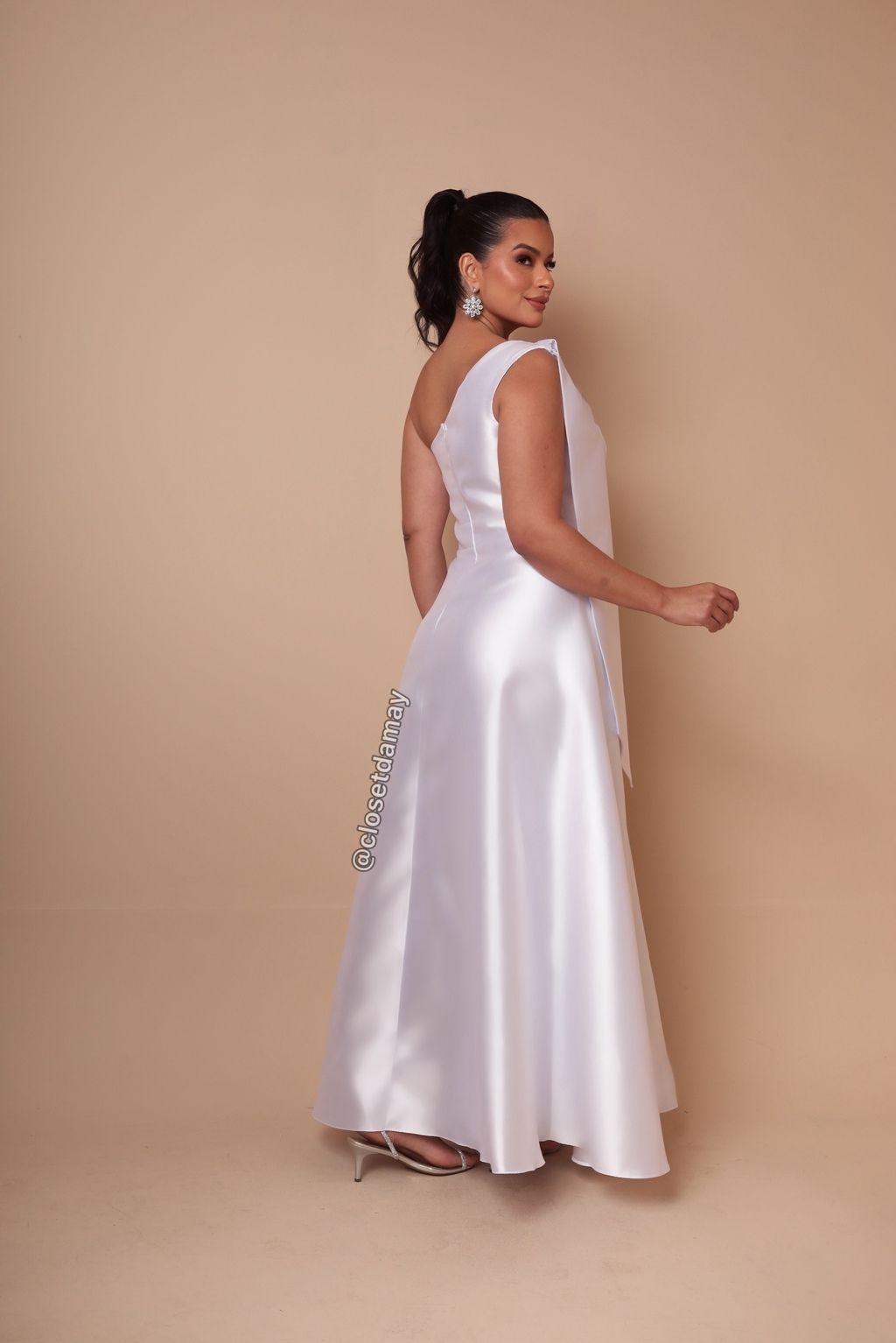Vestido de noiva longo, em zibeline, decote assimétrico, laço no ombro e saia evasê. Possui bojo, forro e zíper.