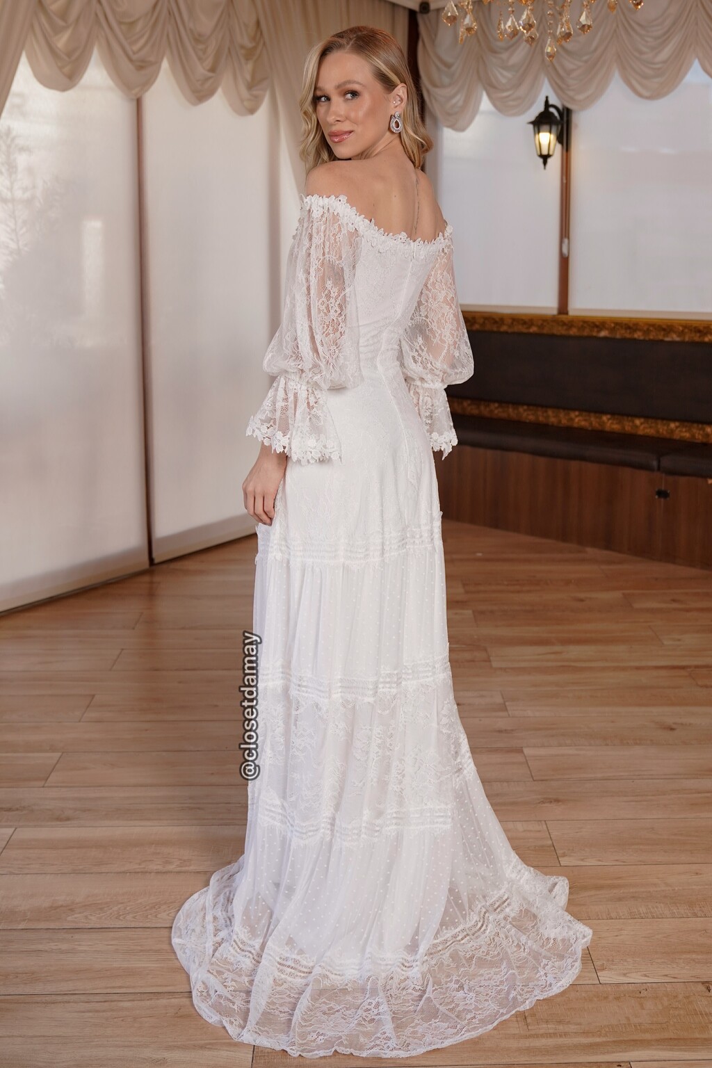 Vestido de noiva longo na cor off white, em mix de rendas e tule de póa, ombro a ombro com mangas 3/4, fechamento nas costas em zíper, caimento leve, uma peça romântica e delicada, que remete uma sutil sensualidade, tecido fluido com elastano, facilitando o seu perfeito caimento. Perfeito para cerimônia civil e também religiosa, ensaio de pré wedding. O vestido perfeito para um momento incrível.