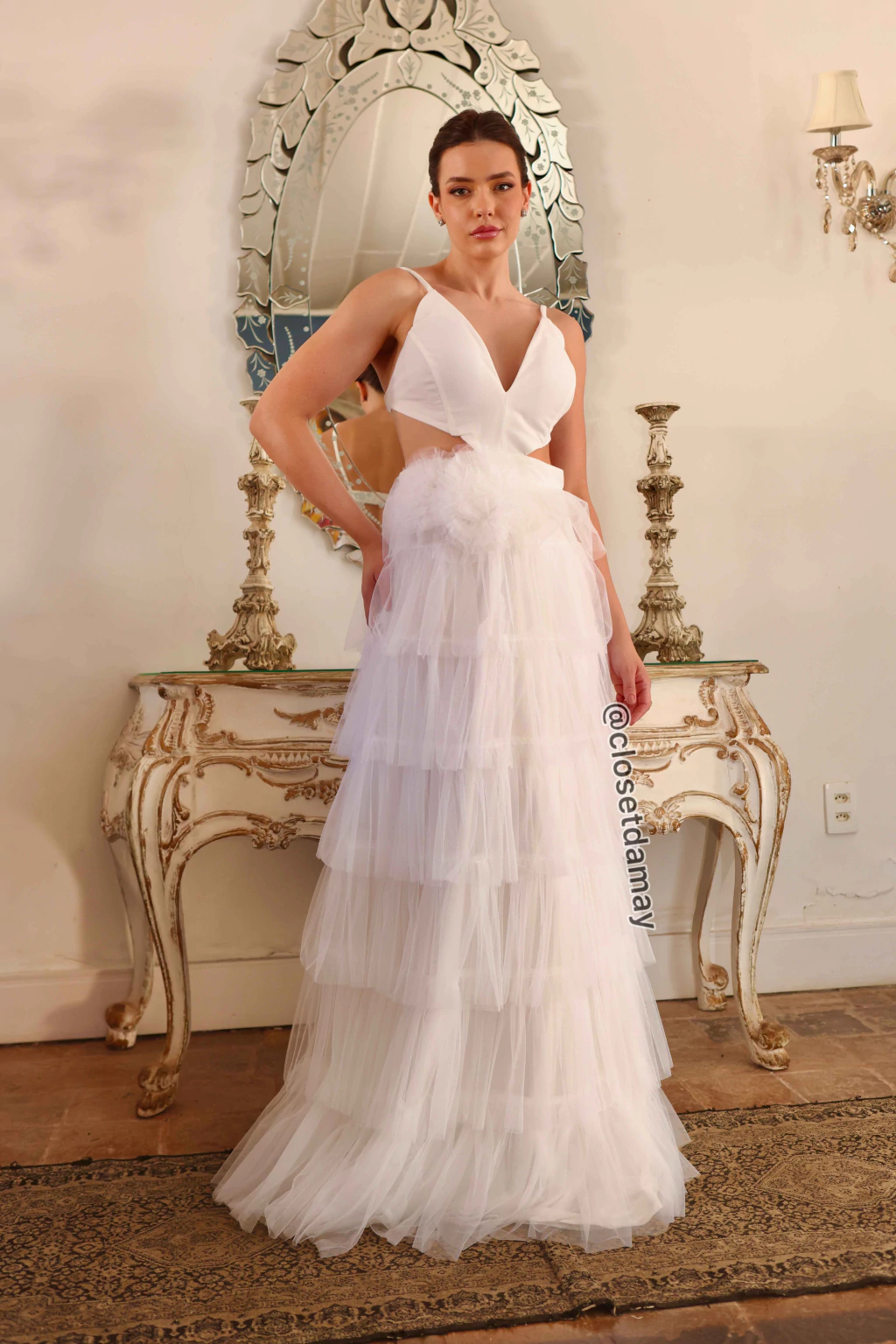 Vestido de noiva longo, em tule, alças finas, decote em v, saia com babado e flores removíveis.Possui bojo, forro e zíper.