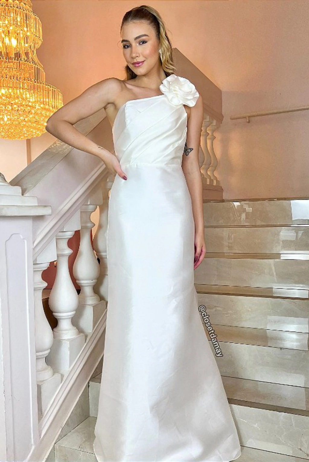 Vestido de noiva longo sereia, em zibeline, nula manga com detalhe floral. Possui bojo, forro e zíper.