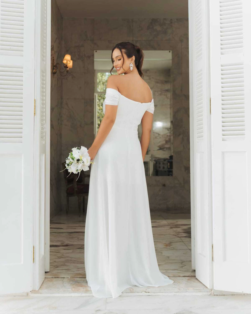 Vestido de noiva longo, decote ombro a ombro sutilmente drapeado, detalhe de broche de flor, saia fluida com movimento por corte arredondado em tecido leve e fenda lateral.