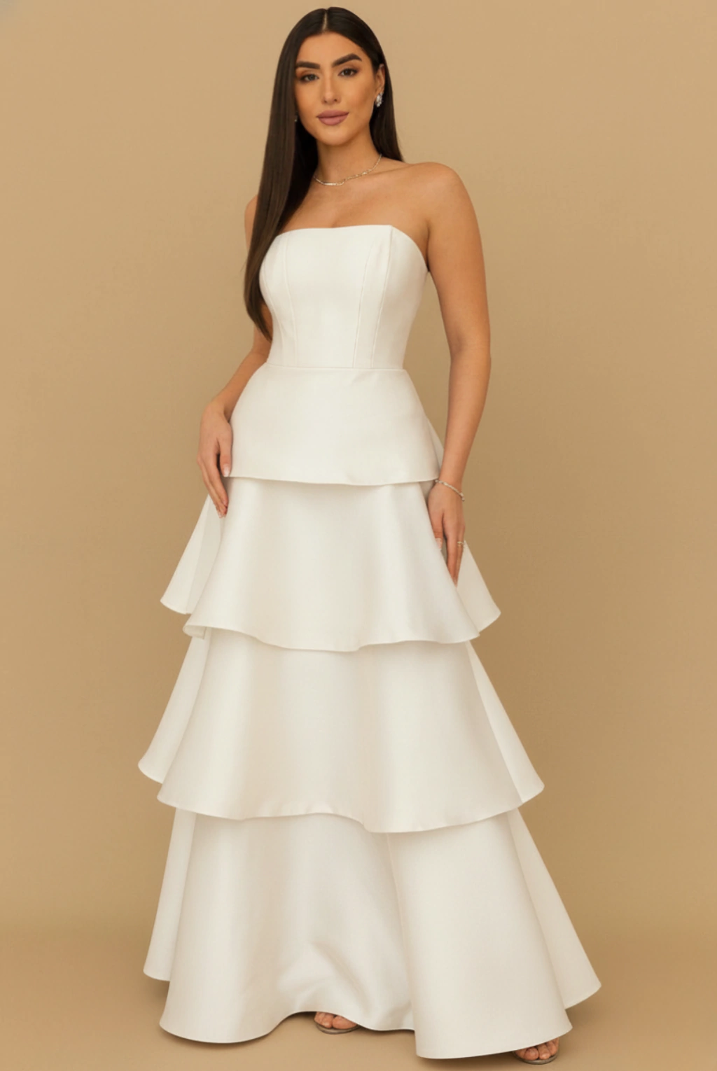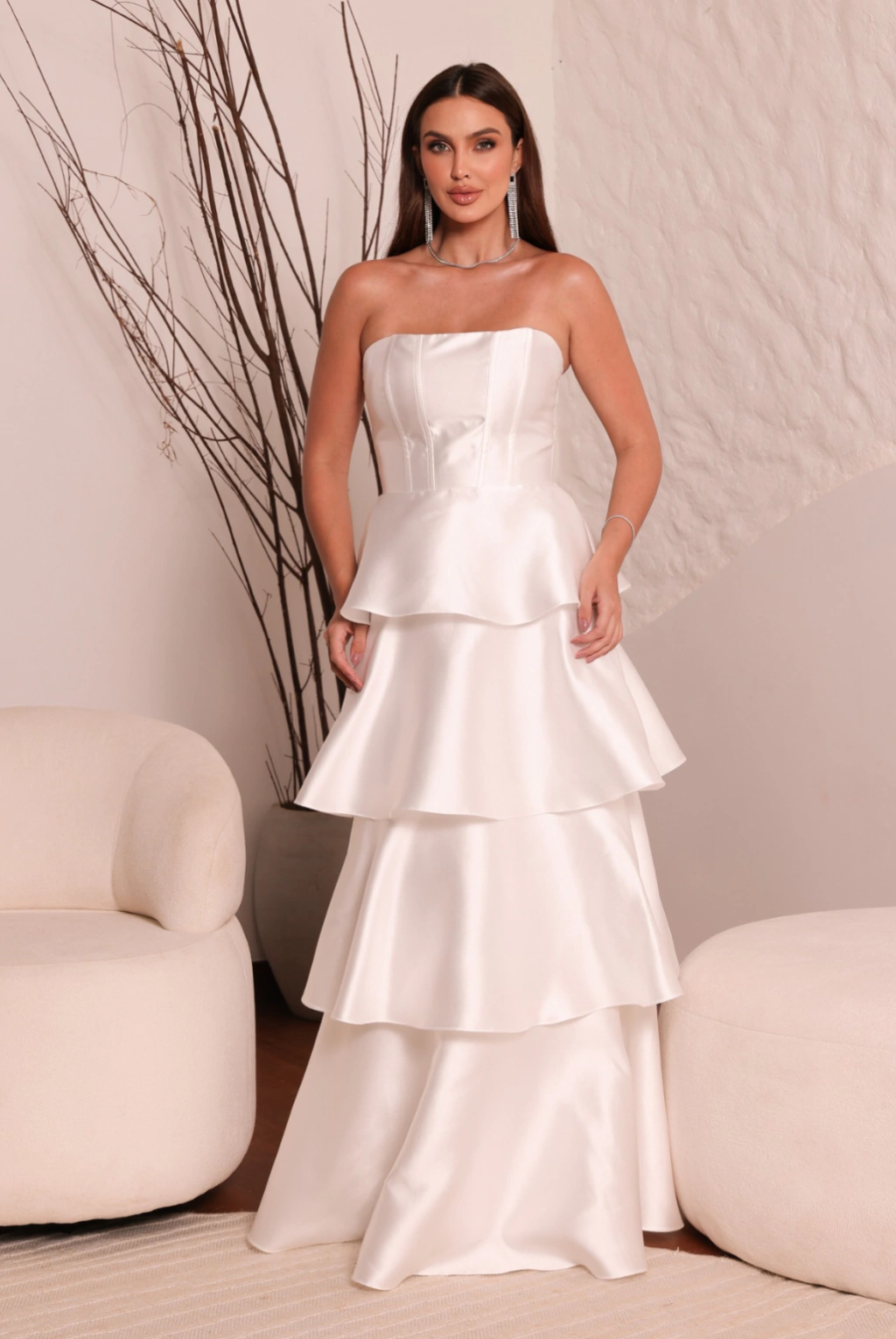 Vestido de noiva longo, tomara que caia, em zibeline, saia evasê com sobreposição de babados e barbatana para dar estrutura no busto e cintura