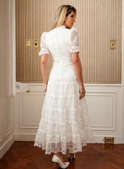 Vestido de noiva midi, em renda e guipir, gola alta e mangas curtas, saia evasê em camadas e leve transparência nas mangas.