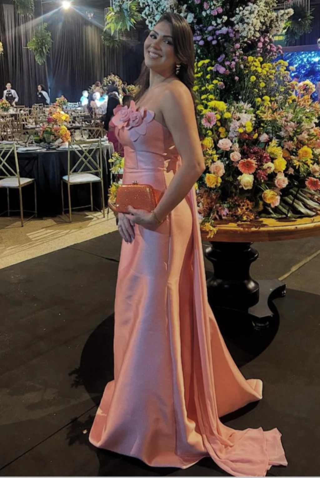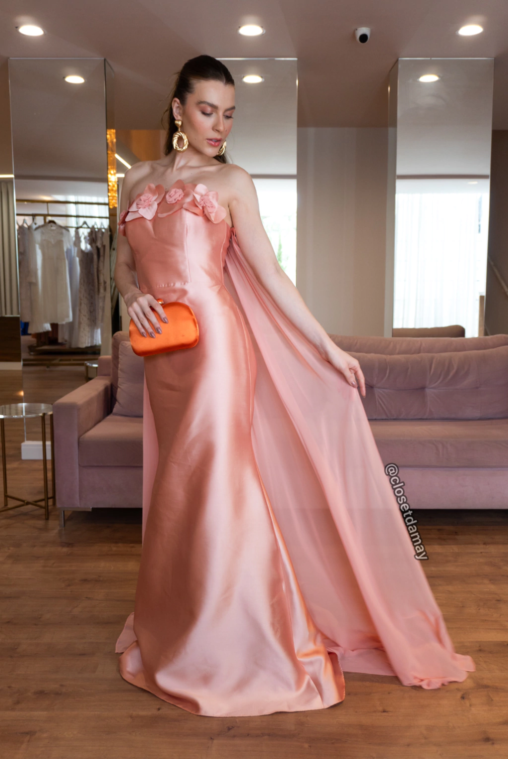 Vestido de festa longo sereia, tomara que caia, aplicação de flores no busto e capa removível. Possui bojo, forro e zíper.